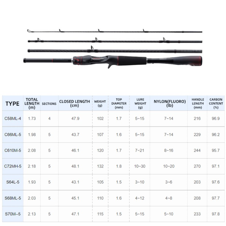 Length: C58ML-4, C66ML-5, C610M-5, C72MH-5, S64L-5, S68ML-5, S70M-5 (m)
